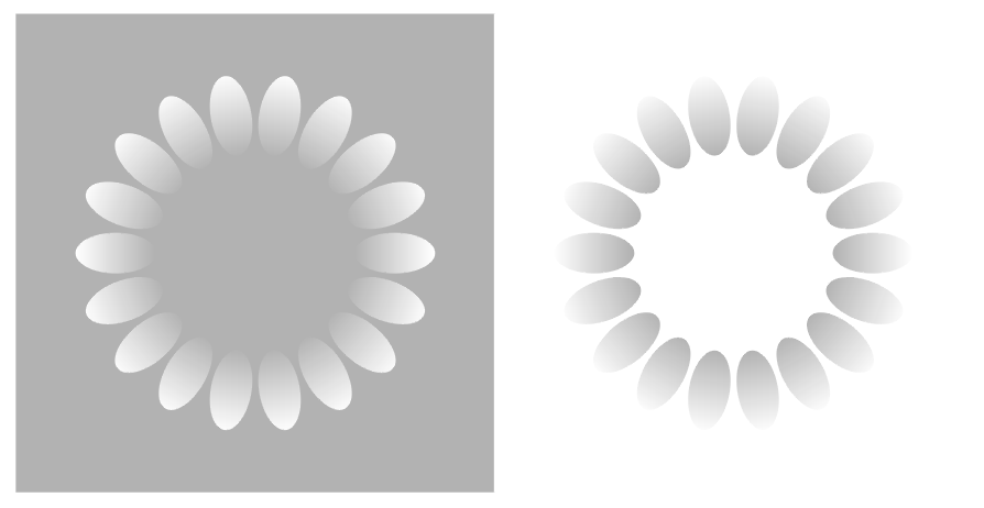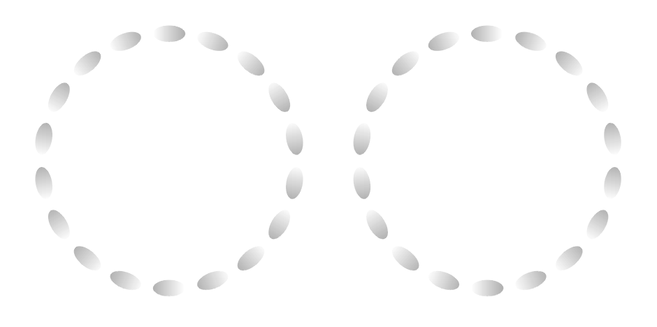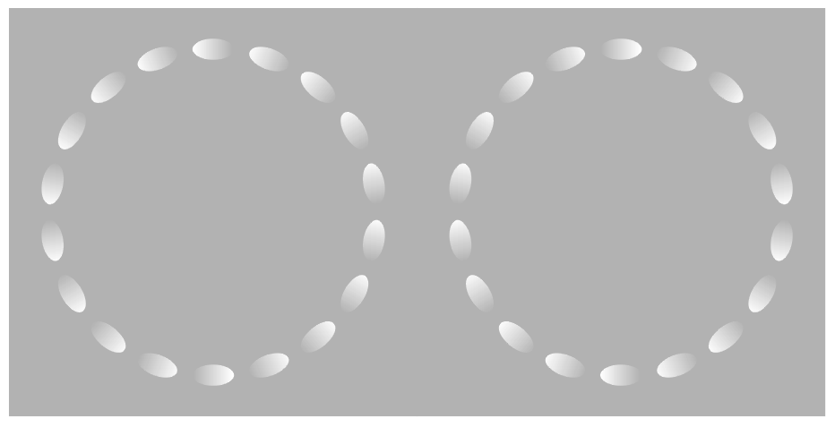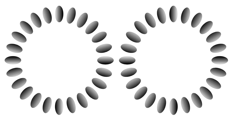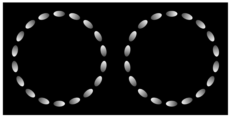 The ellipses appear to be dark in the right panel while those appear to be light in the left panel, though they are of the same luminance gradient.