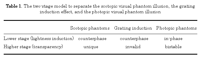 Kitaoka, A., Gyoba, J., Kawabata, H., and Sakurai, K. (2001). Perceptual continuation and depth in visual phantoms can be explained by perceptual transparency. Perception, 30, 959-968. ("Scotopic phantoms" are stationary phantoms)