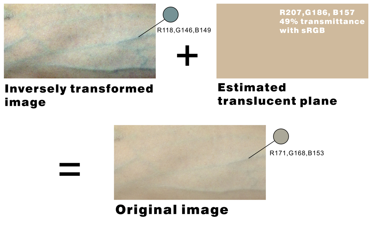 “Vein color illusion” refers to a color illusion that subcutaneous veins appear to be bluish though they actually are of yellowish, orange or reddish hue with low chroma.