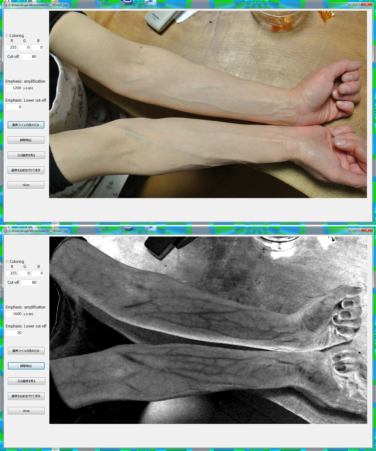 Kitaoka, A. (2014). A variety of color illusion: (13) Vein color illusion. Journal of Color Science Association of Japan, 38(4), 323-324 (in Japanese).
