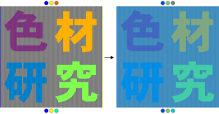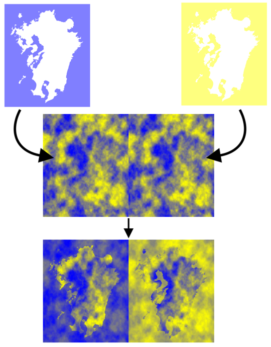 九州部分はどちらも同じパターンなのに、左は黄色い九州に見え、右は青い九州に見える。