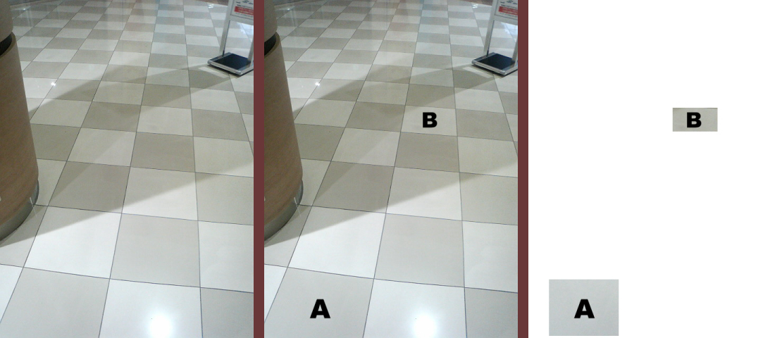 AのタイルはBのタイルより暗く見える(中央の図)が、輝度はAの方が高い(右図)。元の写真(左図)は前橋市で撮影。