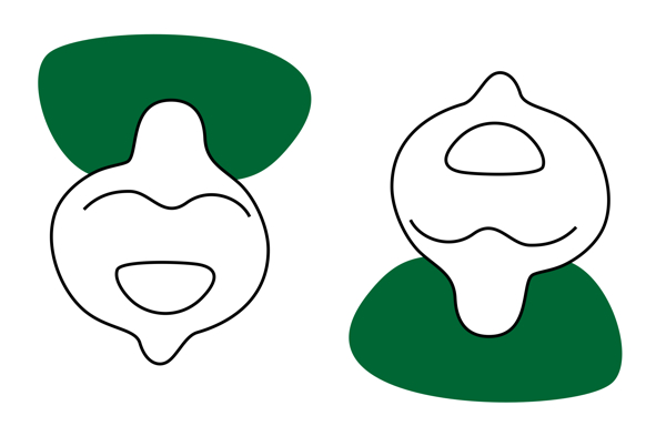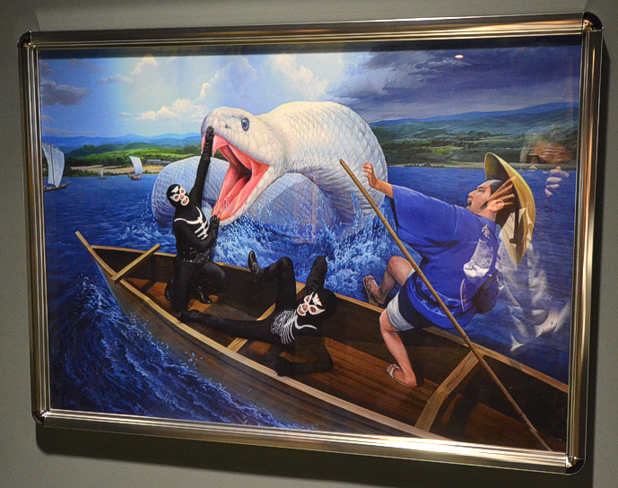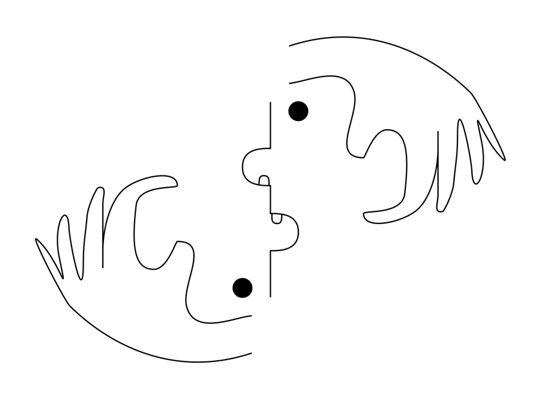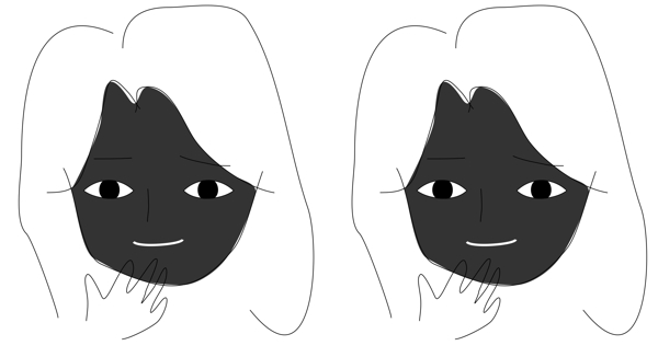 左のほっぺたのぷっくりしたお兄さんの肖像をさかさまにすると、右のようにそんなにぷっくりしていないように見える。土蔵久代氏作品(2011年制作)。許諾を得て掲載。