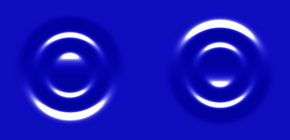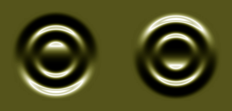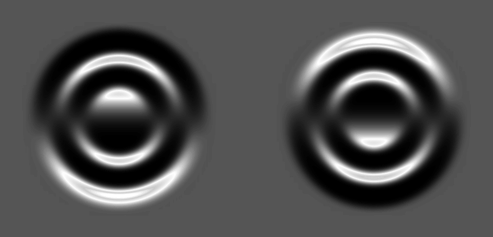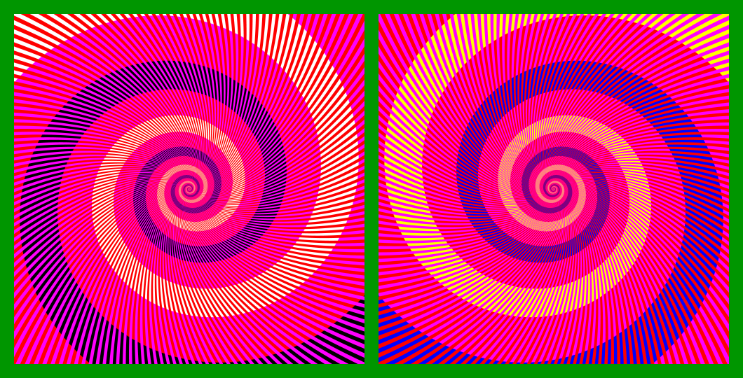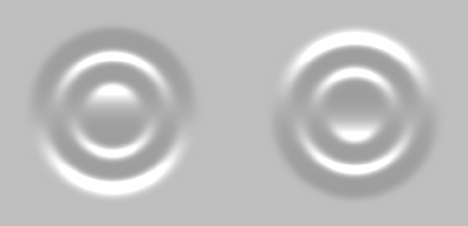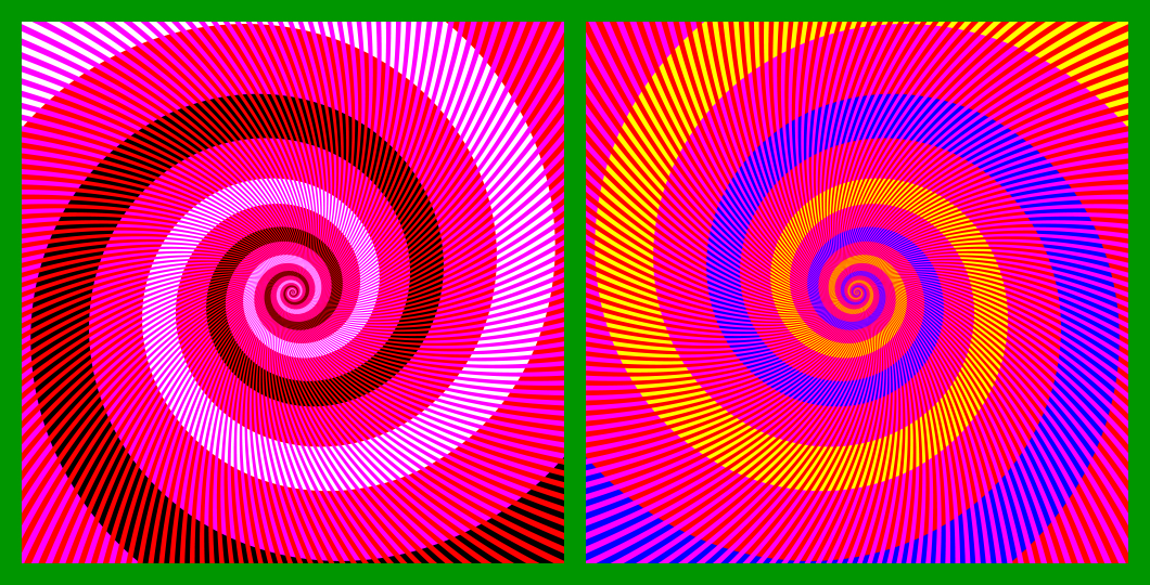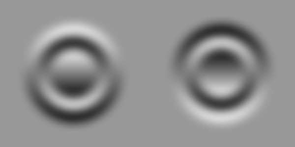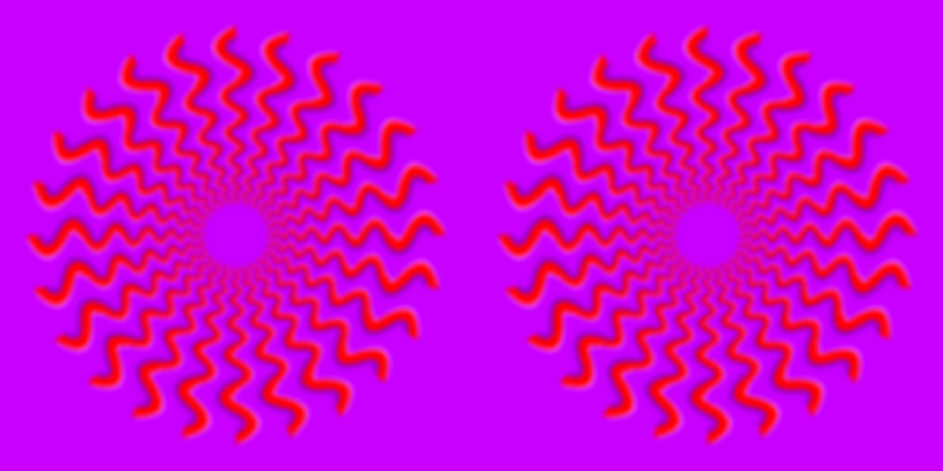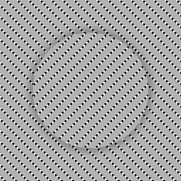 この動画の真ん中をしばらく見て、別のところに目を移すと、視野が波打って見える。この動画は下記の図形を回転させたものであるから、下記の図形を印刷して切り取って、真ん中に棒を通して回しても同じ効果が得られる。リング部分が図となって(手前に見えるオブジェクトとなって)手前に近寄ってくるように見える場合と、リング部分は地となって、図となった内 側と外側が奥に遠ざかるように見える場合とか交替する。