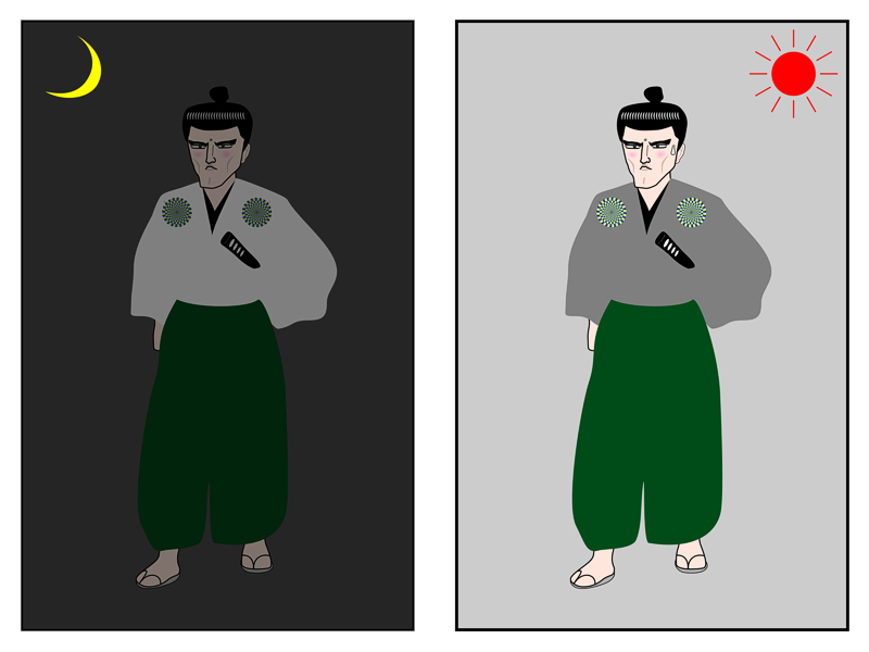 左の図の着物(紋付)は白く見えるが、実際には右の図の着物の灰色と同じ輝度である。