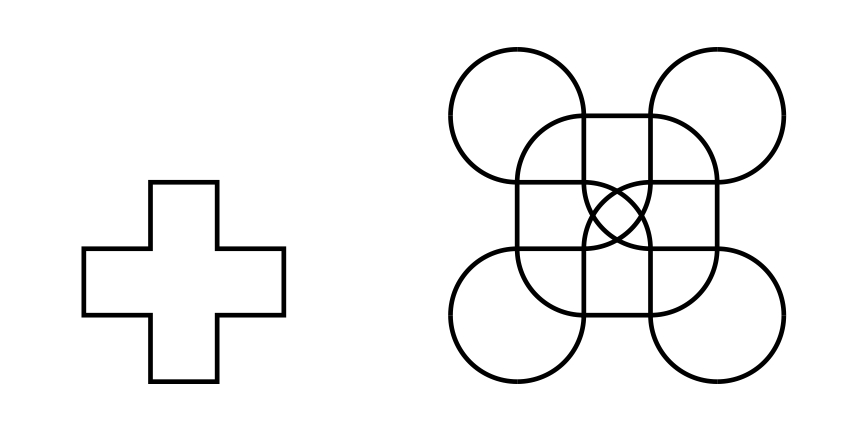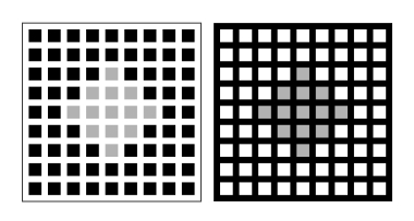 右の図に左の図のような十字形が隠れているが、気づくのに時間がかかる。「よい連続の要因」というゲシュタルト心理学の法則を用いた隠し絵。