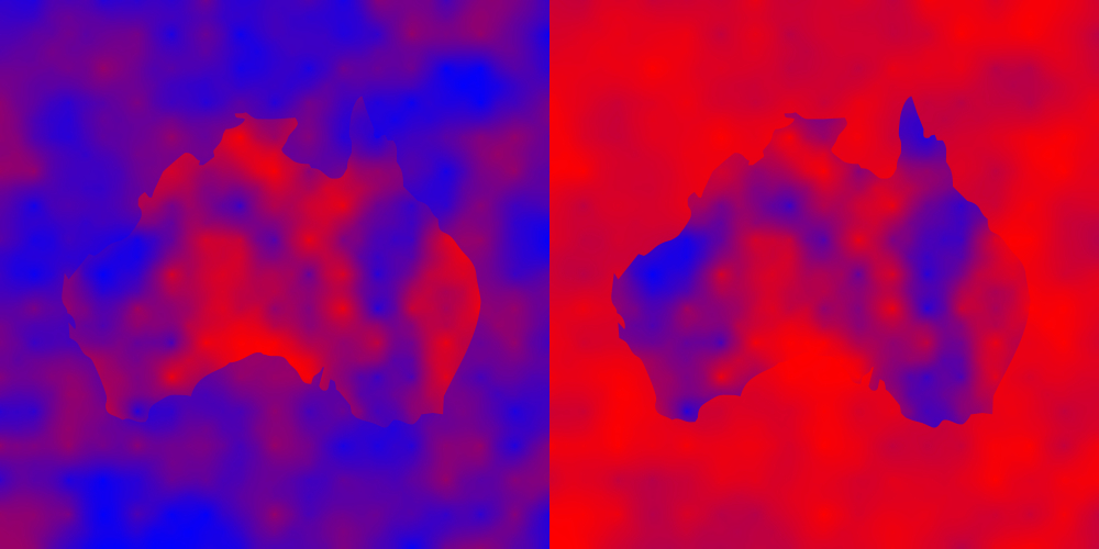The two Australia shapes are physically the same color and texture, but the left Australia appears to be reddish while the right one appears to be bluish with red dust storm blanketing it. This effect depends on the chromatic version of Anderson's illusion.