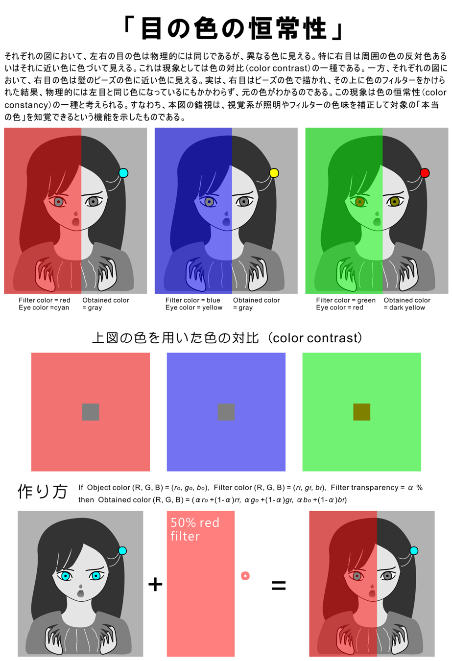 北岡明佳 (2011) 色の錯視いろいろ (1)「目の色の恒常性」という錯視の絵 日本色彩学会誌, 35(2), 118-119. PDF(スキャンコピー)