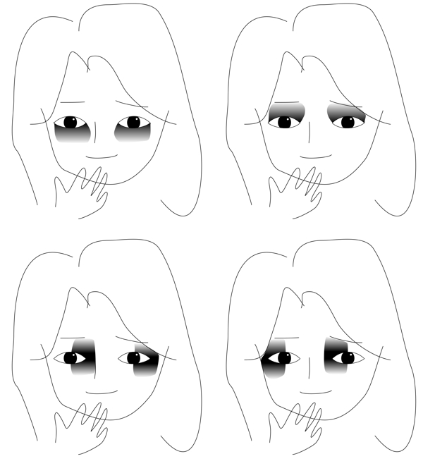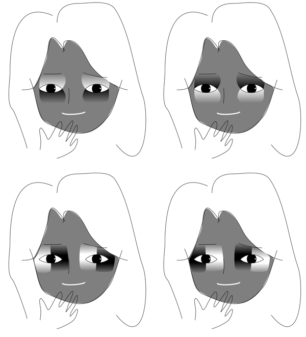 左上の顔は上向きの視線に、右上は下向き、左下は向かって左向きの視線に、右下は向かって右向きの視線に相対的に変位して見える。すなわち、視線方向は暗いアイシャドーとは反対方向に、明るいアイシャドーとは同方向に変位して見える。