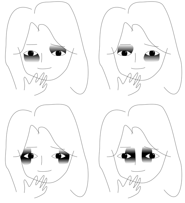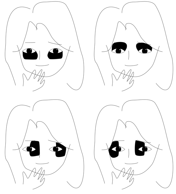 左上の顔は上向きの視線に、右上は下向き、左下は向かって左向きの視線に、右下は向かって右向きの視線に相対的に変位して見える。すなわち、視線方向は付けたアイシャドーの方向に変位して見える。