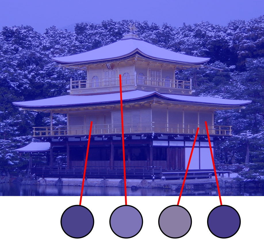 青フィルターがかかっていやな感じではあるが金閣は金色に見える。金色は黄色系統でなければならないという前提があるなら、この合成画像で金閣が金色に見えることは錯視であり、知覚される金色は物理的には青系統の色である。