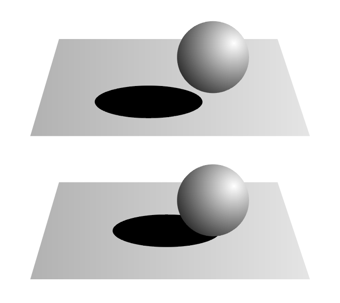 上の図の台形が下の図の台形よりも大きく見える(ジャストローの台形錯視)がこれにすぐには気づかないのは、影が物体の空間位置の知覚に及ぼす効果のデモンストレーション(影の位置が違うだけなのだが上図では球が浮いて見える)に注意が取られてしまうためであろう。