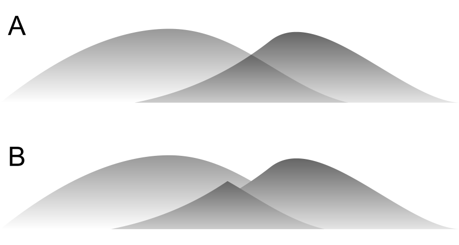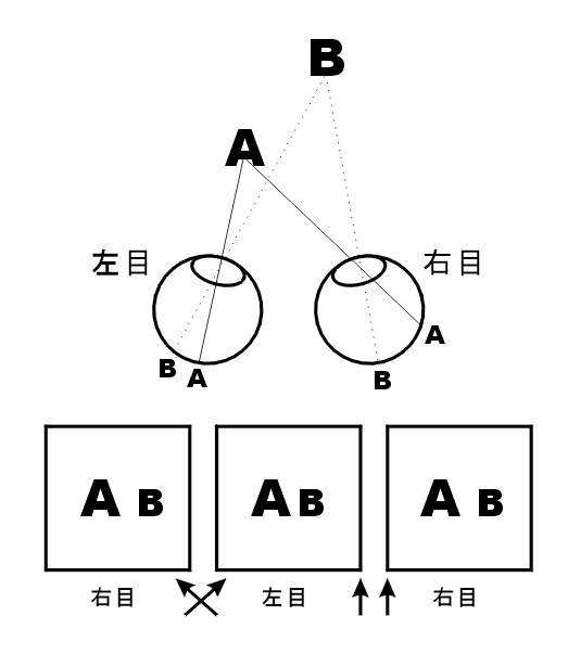 図のような奥行きの位置に物体Aと物体Bがあると、右目に映るAB間の距離は、左目のそれよりも長くなる(両眼視差)。この情報を手がかりにして計算されて作られた知覚が、両眼立体視である。