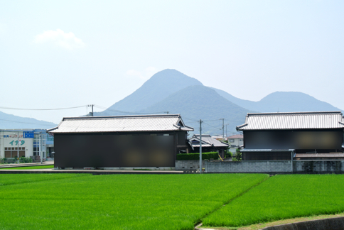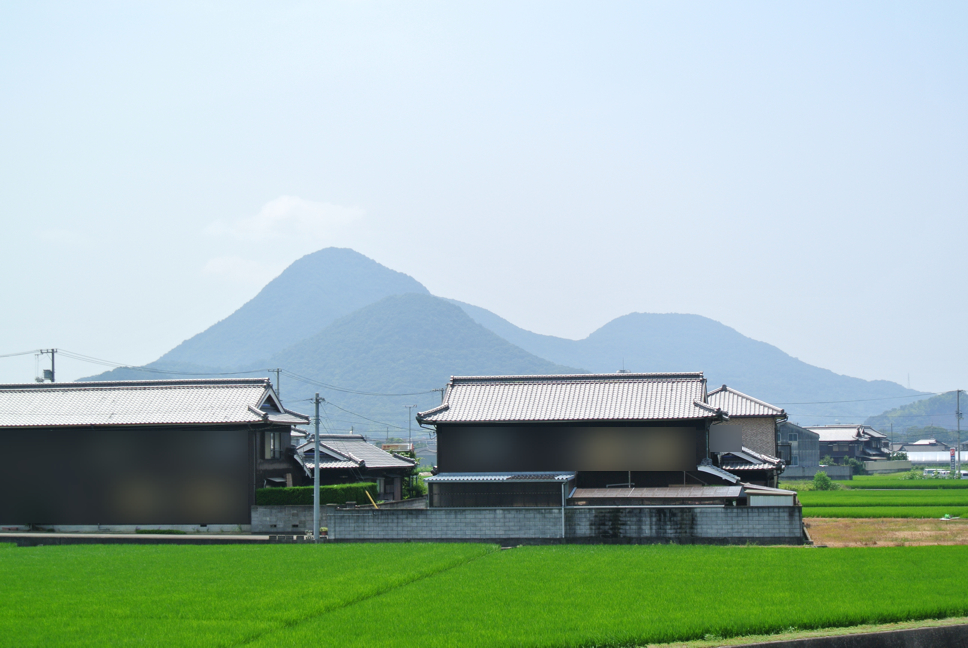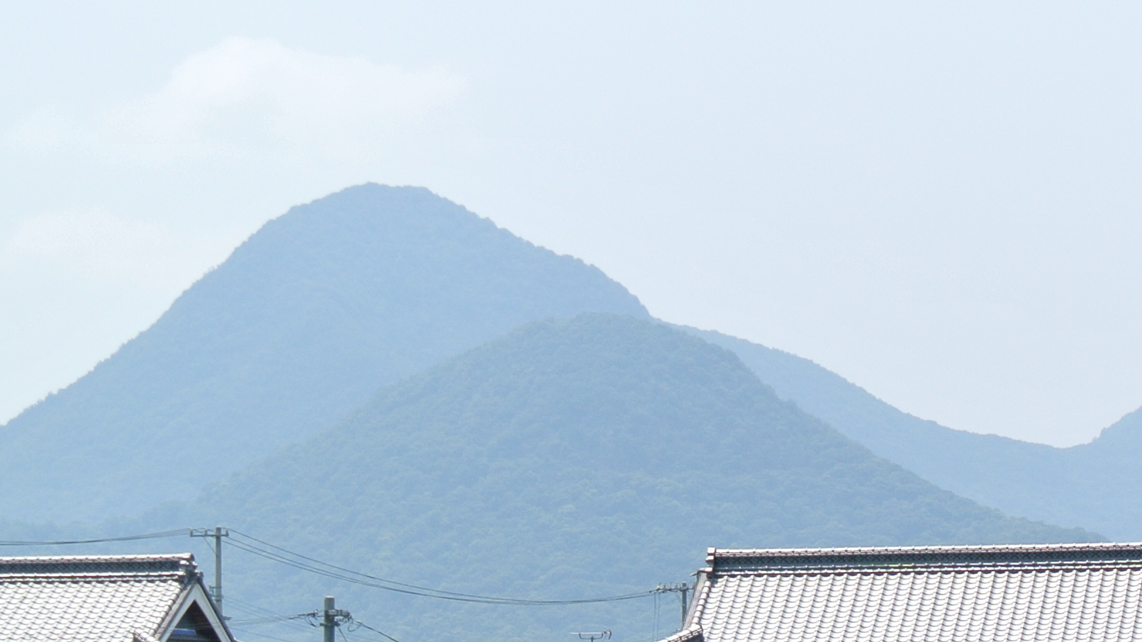 手前の山は「筆ノ山」(ふでのやま)、奥の山は「我拝師山」(がはいしやま、がはいしざん)と思われる。