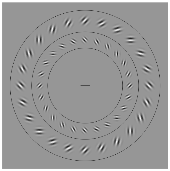Rings appear to rotate. This image was originally developed for the spiral illusion, in which the concentric gray lines appear to be a spiral. My nengajo