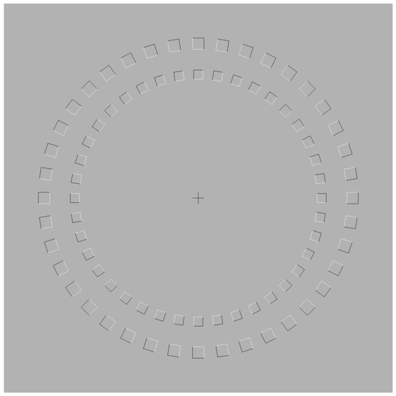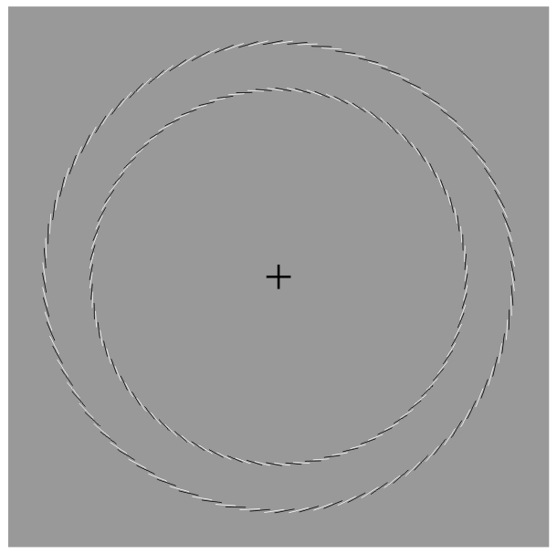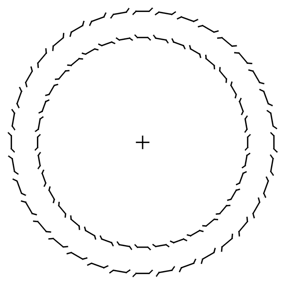 The two concentric arrays of S-shaped figures appear to rotate in the different directions when we approach or move away from the figure while fixating at the center.*