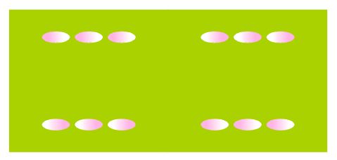 Although each pair of the upper and lower ellipses is aligned vertically, the upper row appears to shift inward as compared with the lower one.