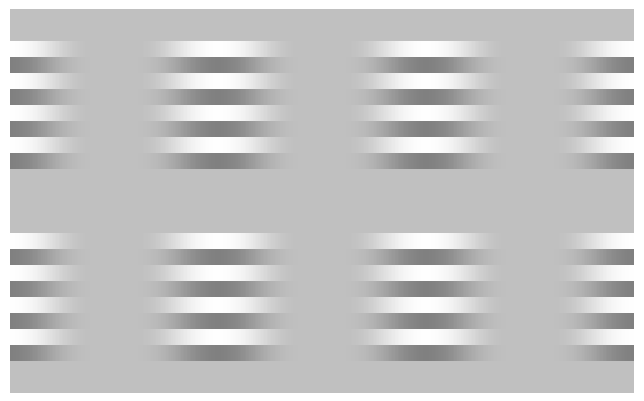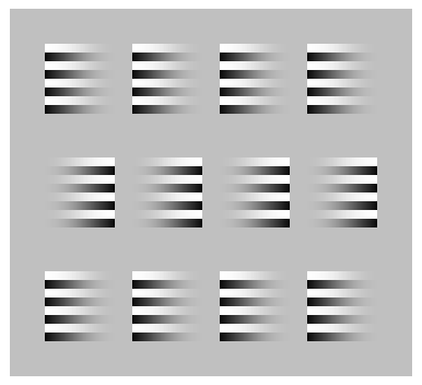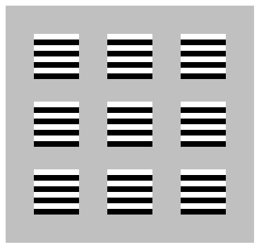 There is another subtype of this illusion as shown below. Each square made up of horizontal stripes appears to expand in the horizontal direction. In this case, the direction of illusory motion can be described as "high-to-low contrast". The figures of this subtype are characterized by luminance edges, not luminance gradients.
