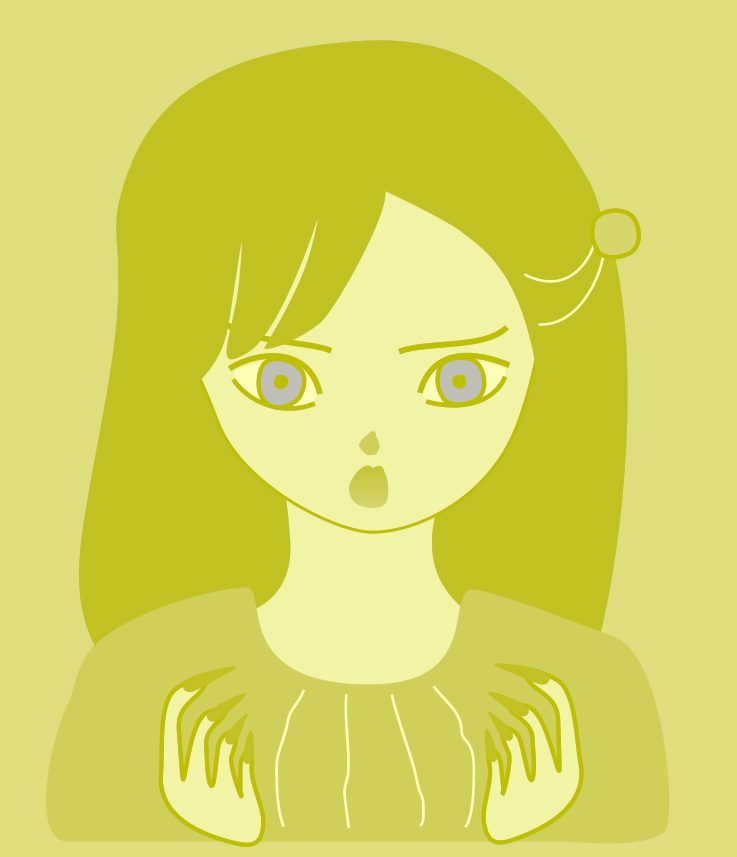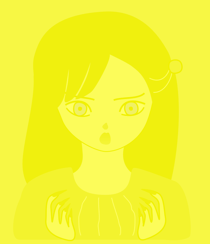 イラストの目(虹彩)は青に見えるが、黄の色相である(R191, G191, B184)。加法色は黄で、透明度(アルファ値)は48%の加法的色変換。