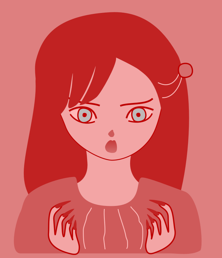 イラストの目(虹彩)は水色に見えるが、赤の色相である(R191, G184, B184)。加法色は赤で、透明度(アルファ値)は48%の加法的色変換。