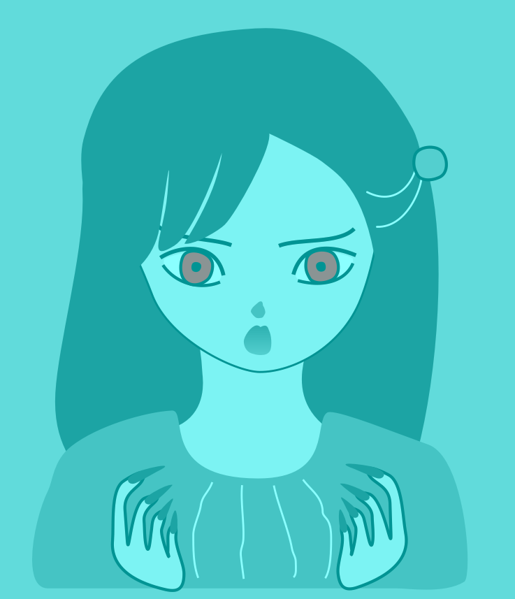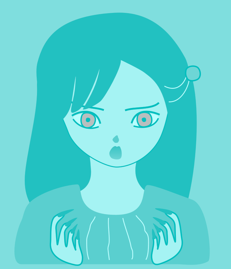 イラストの目(虹彩)は赤く見えるが、シアン色の色相である(上の図は R138, G148, B148 で、下の図は R184, G191, B191 である)。加法色はシアンで、透明度(アルファ値)は48%の加法的色変換。
