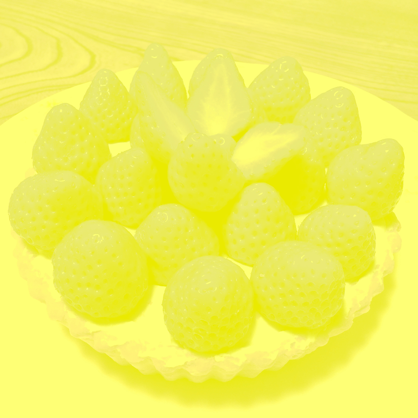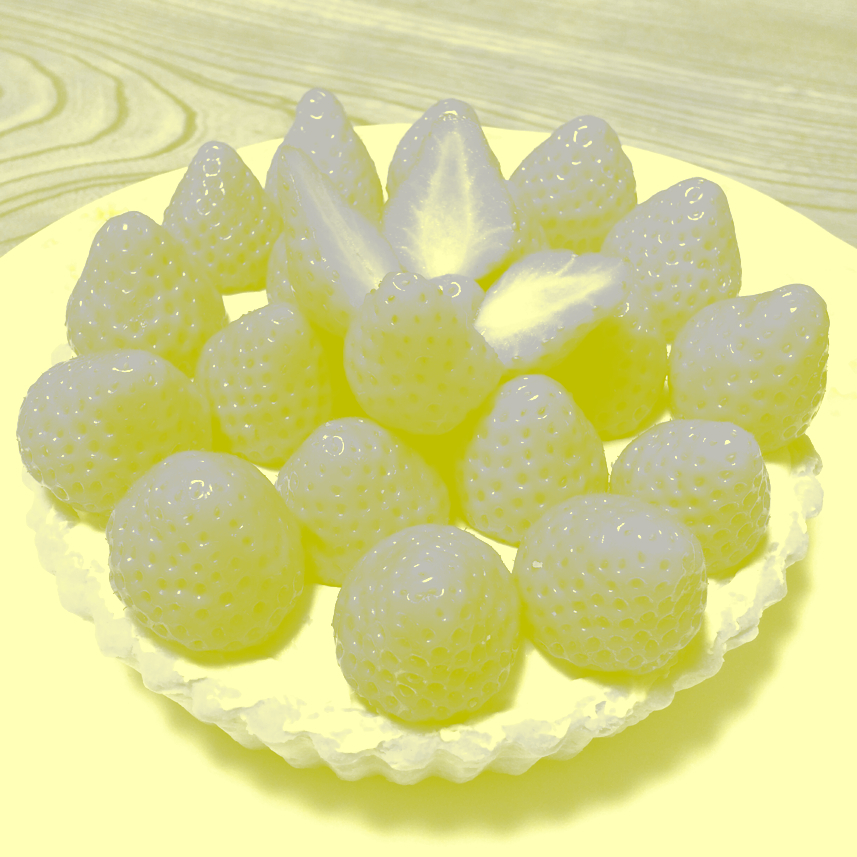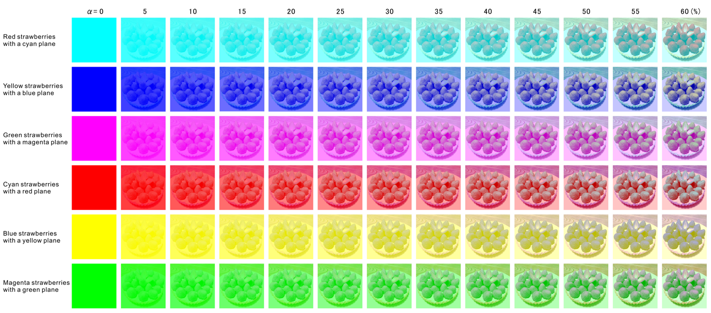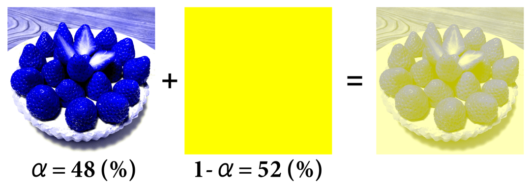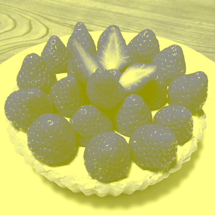すべてのピクセルは黄色の色相であるが、イチゴは青く見える。加法色は黄色で透明度は48%の加法的色変換。