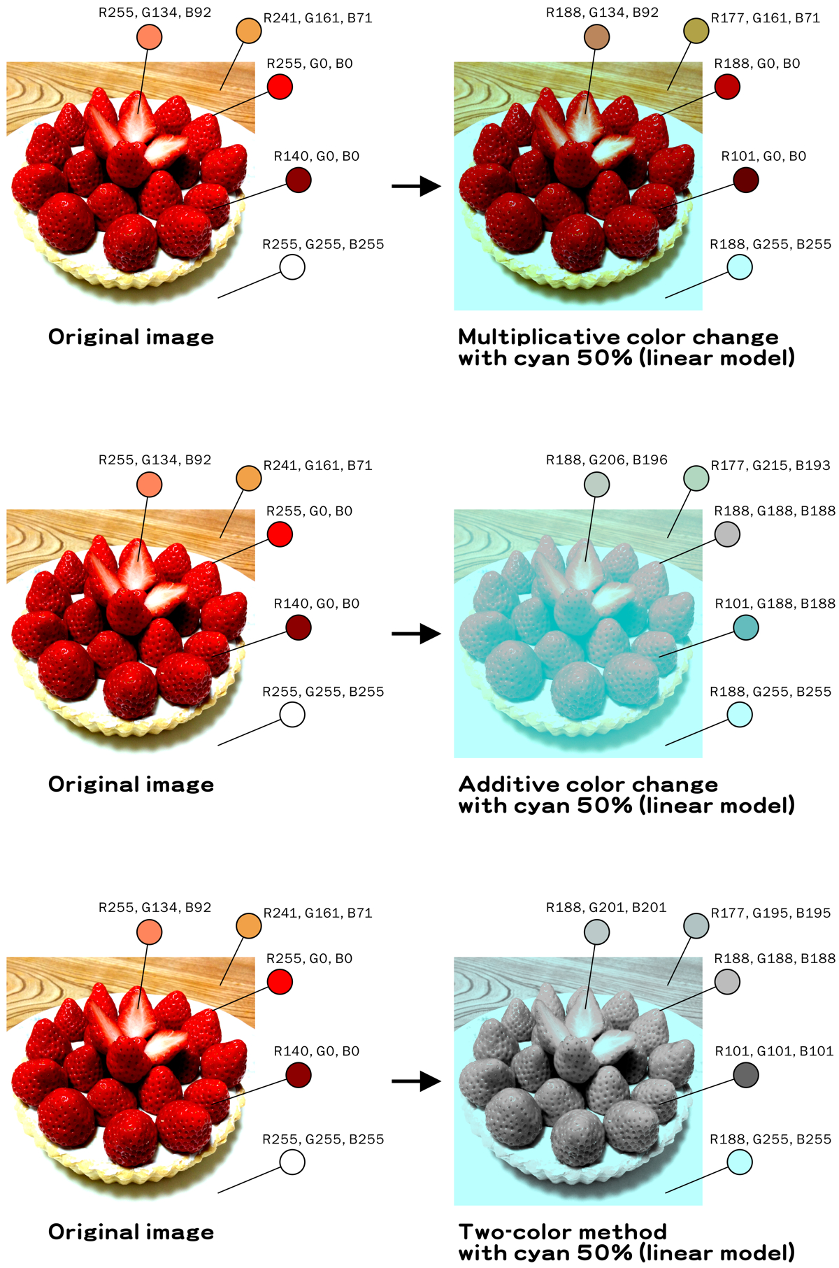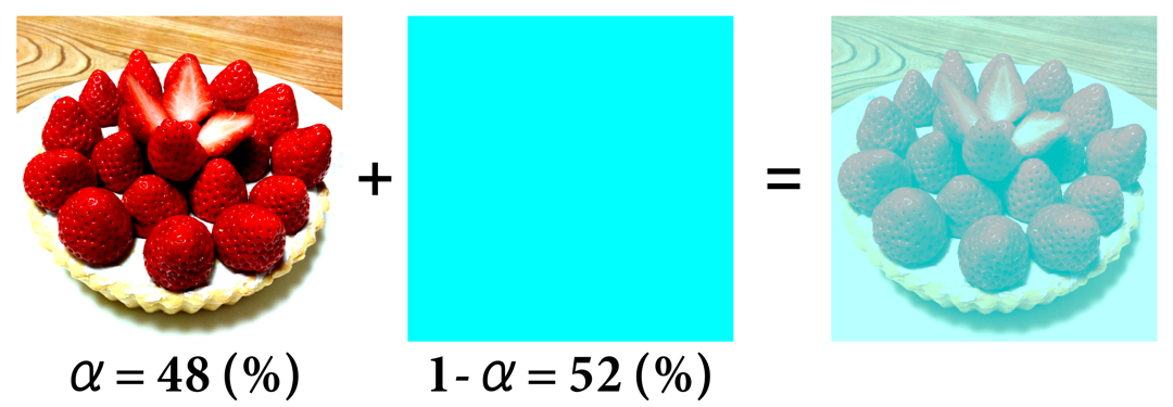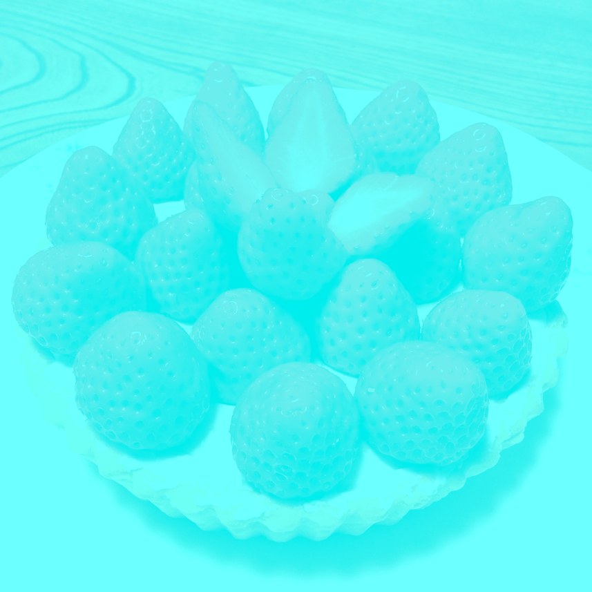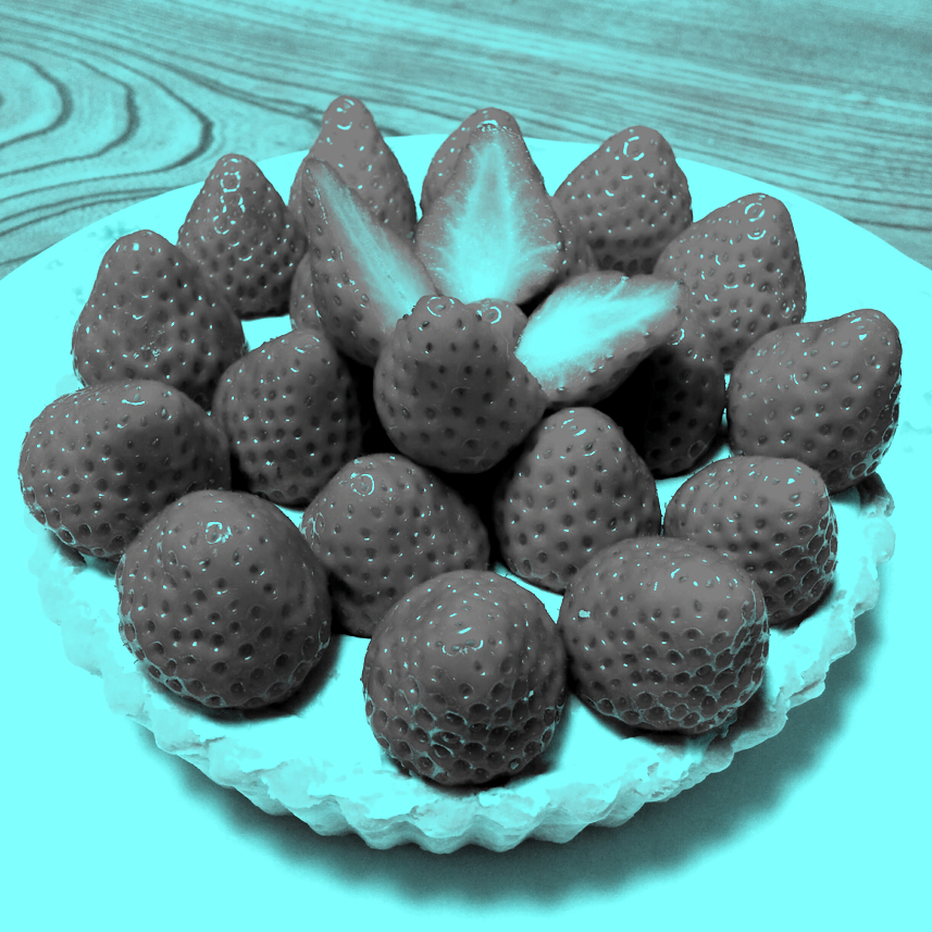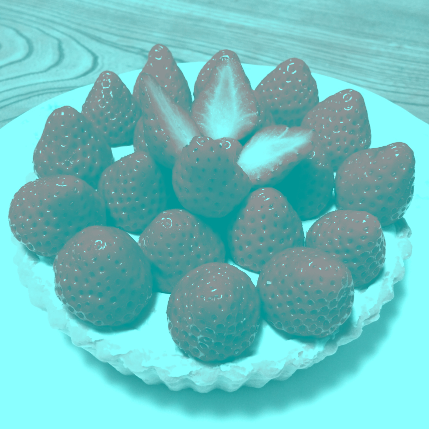 すべてのピクセルはシアン色近辺の色相であるが、イチゴは赤く見える。加法色はシアンで、透明度(アルファ値)は48%の加法的色変換。