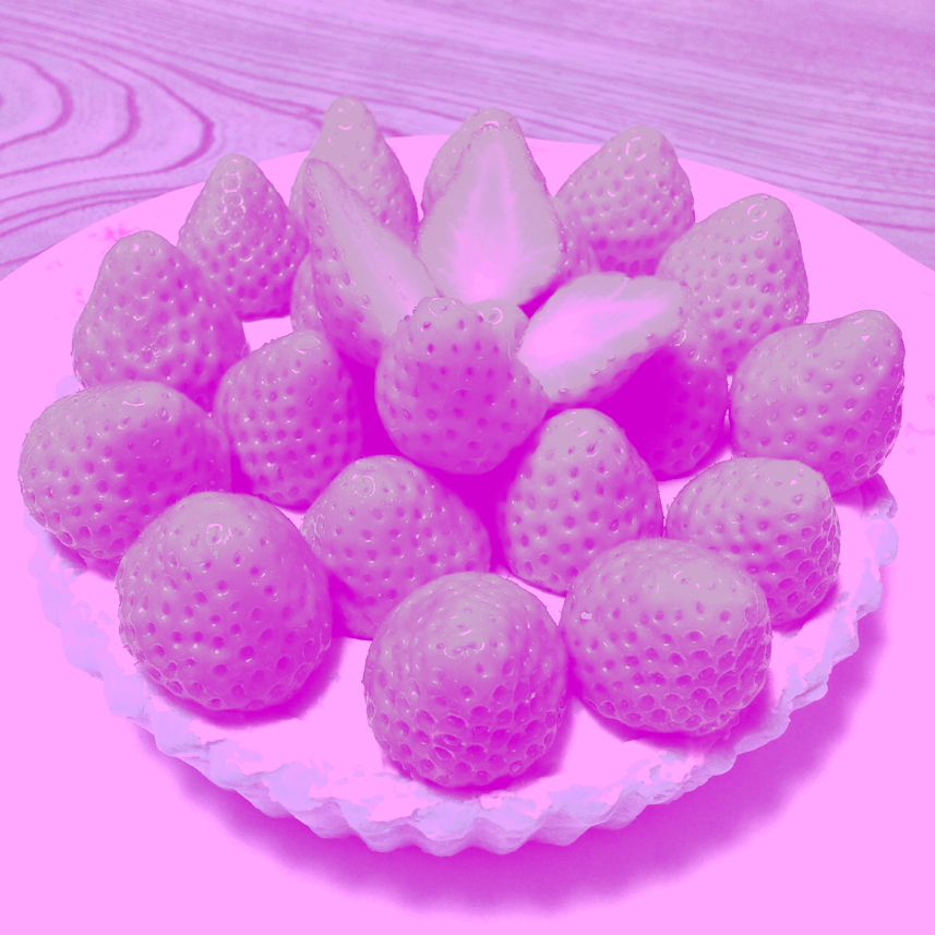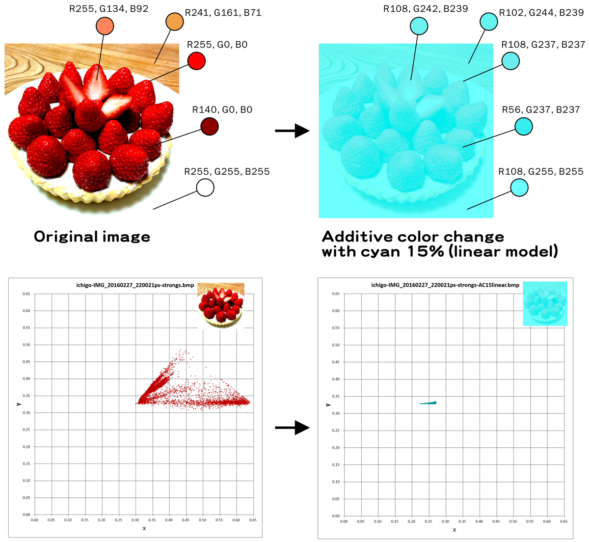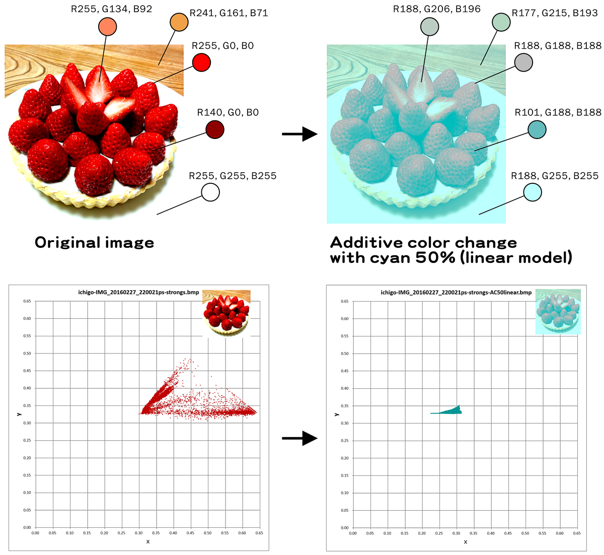 すべてのピクセルはシアン色近辺の色相であるが、イチゴは赤く見える。加法色はシアンで、透明度(アルファ値)は48%の加法的色変換。