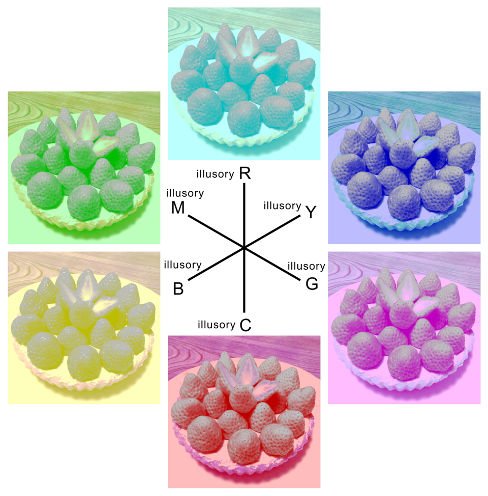 3. これらの色相の差は、原画がイチゴの場合とイラストの目(虹彩)の場合で同様であり、記憶色による影響というよりは、色の知覚そのものの現象と考えられる。