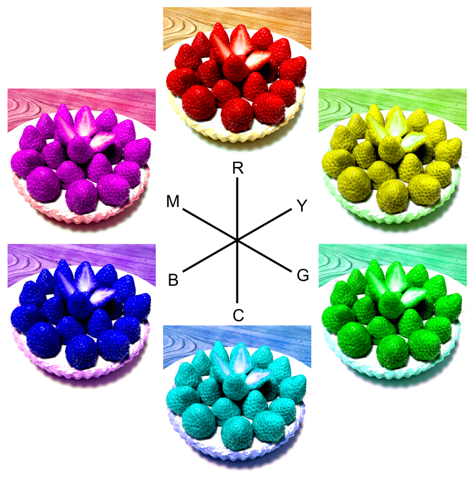 すべてのピクセルはシアン色の色相(一部灰色)であるが、イチゴは赤く見える。