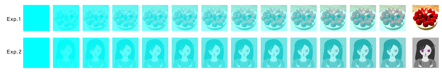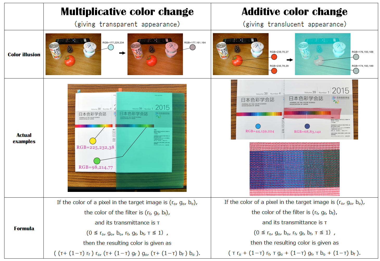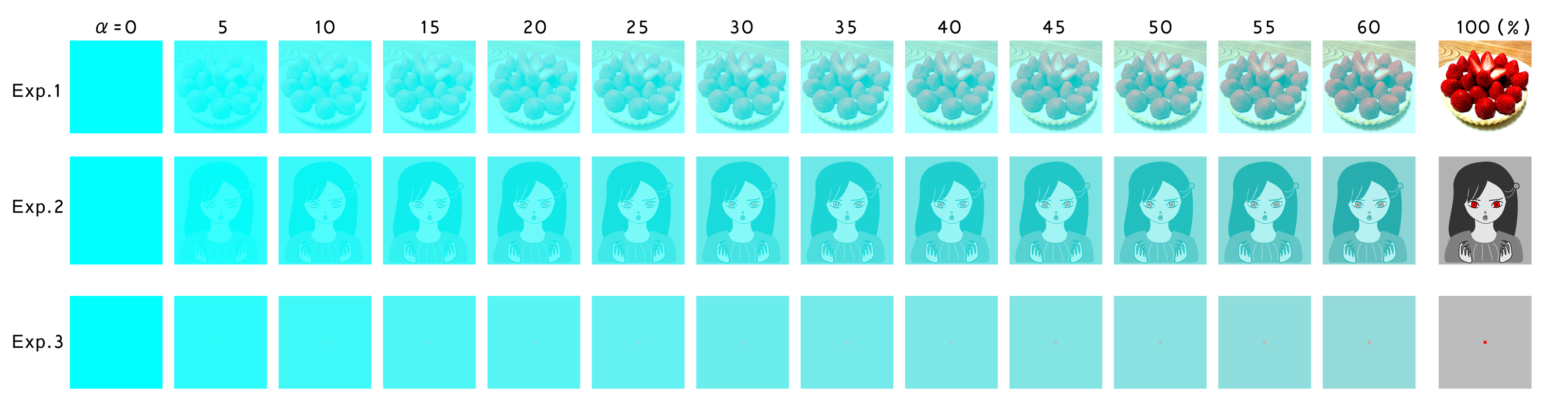 加法的色変換(アルファブレンディング)による変換画像は、元の画像の色に対して頑健な色の恒常性を示す。変換画像の画素のすべてが反対色の色度になっていても、元の画像の色の恒常性を示すことがわかっている。この現象については、定量的な測定はなされていないと思われる。そこで、アルファ値をパラメーターとして、色の恒常性の強さをその閾値で測定した。刺激として、イチゴの画像を用いた。オリジナルの画像は赤いイチゴであるが、色相の変換を行ない、黄・緑・シアン・青・緑のイチゴの画像も作成し、それぞれの反対色の一様な面とアルファブレンディングを行なった。結果としては、いずれの色の画像でも強い色の恒常性を示した。たとえば、赤のイチゴの画像では、閾値はアルファ値で約15%であった。これは、全画素においてかなり彩度の高いシアン色の色度の画像でも、赤いイチゴが知覚されることを示す。一方、緑のイチゴの画像の閾値が最も高く、アルファ値で約38%であった。それでも、全画素においてマゼンタ色の色度の画像であった。これらの知見を、色の対比や記憶色の視点において考察する。