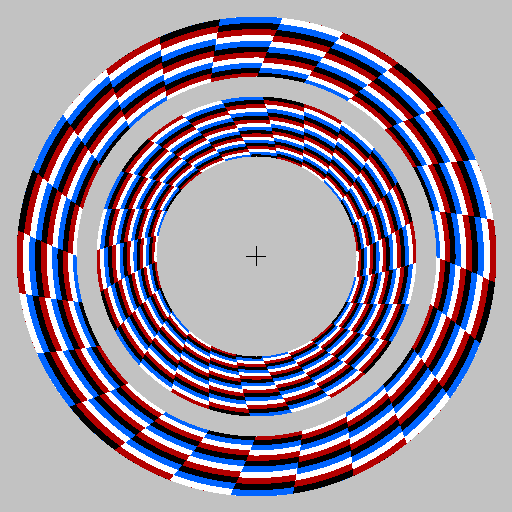 The rings appear to be red when observers approach the figure while fixating at the center, whereas they appear to be blue when observers move away from the figure while fixating at the center. For both cases, the rings appear to rotate in the different directions.