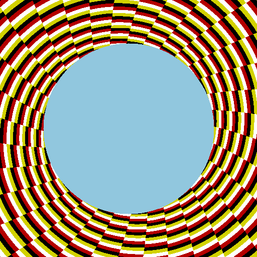 The inner ring appears to contract while the outer one appears to expand (optimized Fraser-Wilcox illusion). Moreover, the rings appear to rotate in the opposite directions when observers approach or move away from the image fixating at the center (Rotating Ouchi illusion). Furthermore, the inner ring appears to be more pale-bluish when observers approach the image fixating at the center, while the outer ring appears to be more pale-bluish when observers move away from the image. This image thus gives three different illusions.