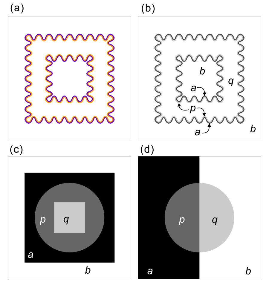 Figure 7. Watercolor illusion and apparent transparency. (a) The watercolor illusion. The corridor area appears to be tinted orange, to be veiled, and to be figure. (b) Achromatic watercolor illusion. The corridor area q appears to be veiled, to be darker than the surround b though they are the same in luminance, and to be figure. The alphabets a, b, p and q correspond to those shown in (c) or (d). (c) A possibly novel image of apparent transparency. It appears that a black square bearing a square window in the center is placed on the white background, and that a translucent disk appears to be in front of the black square and to cover the window entirely. The disk always appears to be transparent in front, i.e. unique transparency (Adelson and Anandan, 1990; Anderson, 1997). (d) Metelli's figure demonstrating unique transparency. The disk always appears to be transparent in front.