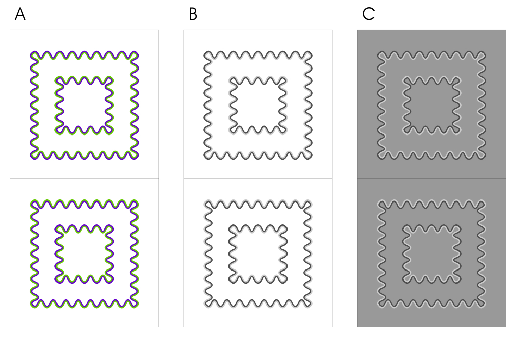 (A) Watercolor illusion (Pinna, Brelstaff and Spillmann, 2001). Although the whole area except waving borders is homogeneously white, the corridor part appears to be tinted green in the upper panel while the outer and inner parts appear to be tinted so in the lower panel. (B) Achromatic watercolor illusion. Although the whole area except waving borders is homogeneously white, the corridor part appears to be tinted gray in the upper panel while the outer and inner parts appear to be tinted so in the lower panel (Noguchi, Kitaoka and Takashima, 2008). (C) Sumi painting effect. Although the whole area except waving borders is homogeneously gray, the corridor part appears to be tinted lighter in the upper panel while the outer and inner parts appear to be tinted so in the lower pane (Takashima, 2008). These figures are drawn by Akiyoshi Kitaoka.