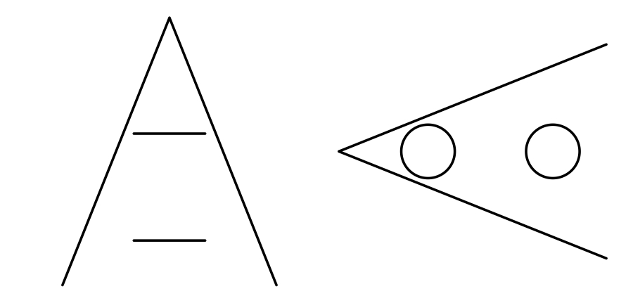 The upper line segment appears to be longer than the lower one, though they are the same size. The left circle appears to be larger than the right one, though they are the same size.
