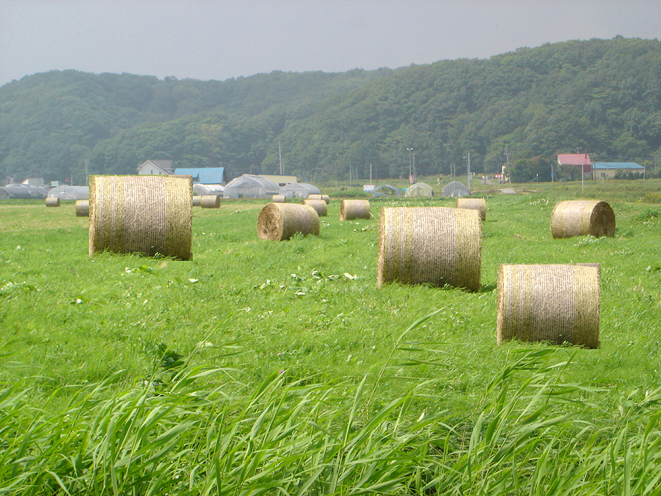 The three hay rolls project the same retinal size, but the leftmost one appears to be the largest and the rightmost one the smallest.