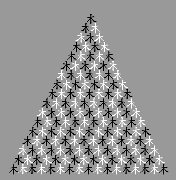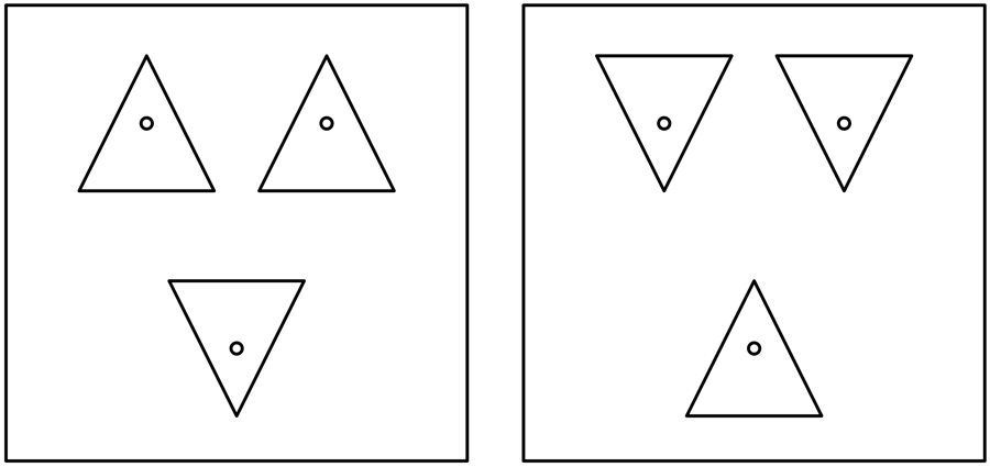 Each dot is located at the middle point between the apex and the bottom line of the surrounding triangle, but the dot appears to be closer to the apex. This demosntration way of the Müller-Lyer illusion is already known.