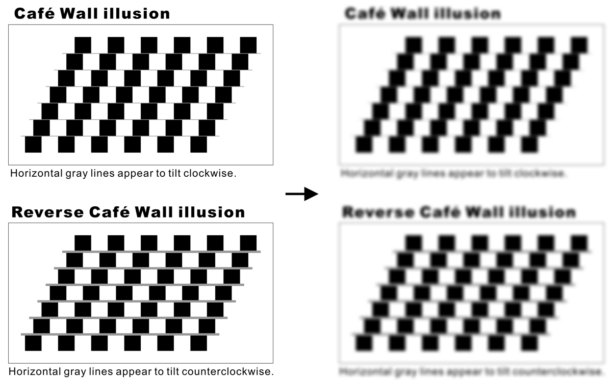 A Café Wall illusion image is converted to a reverse Café Wall illusion image when blurred (Gaussian) while a reverse Café Wall illusion image is converted to a Café Wall illusion image when blurred!