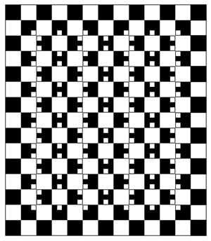 The uppermost horizontal row appears to tilt clockwise and the others appear to tilt alternately. This apparent tilt depends on the Zöllner illusion and the Café Wall illusion.