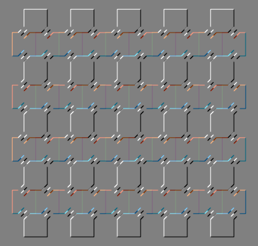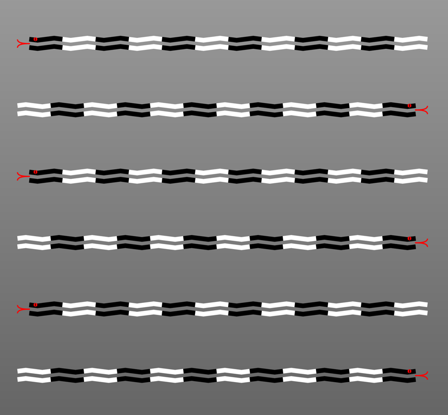 Blocks of wavy lines are aligned horizontally, but the uppermost, third and fifth blocks appear to tilt counterclockwise whereas the rest clockwise.