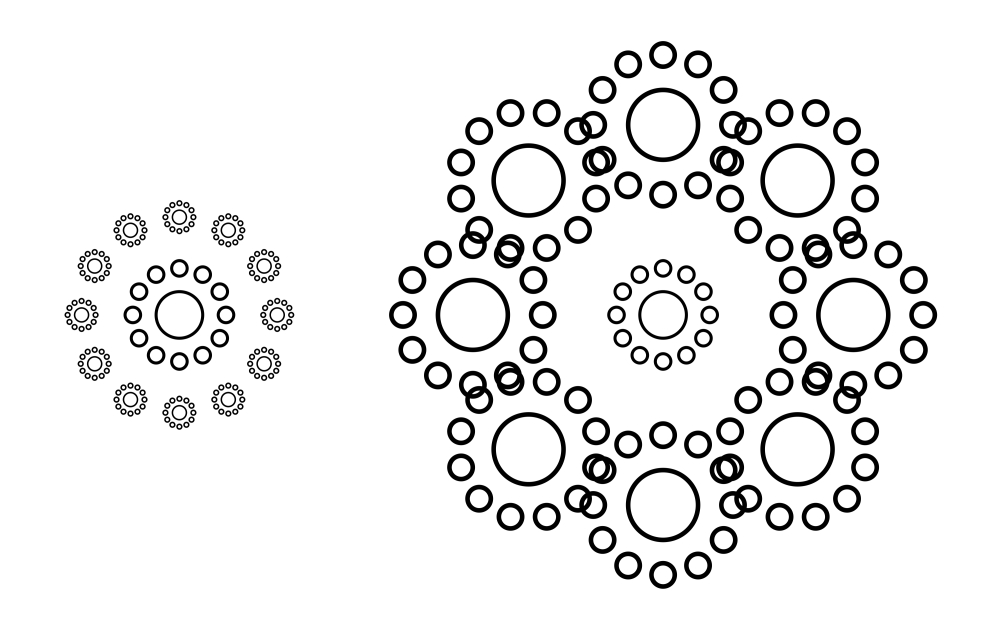 Each inset of the twelve concentric circles appears to be larger (Delboeuf illusion) or thicker than the central circle, though they are physically identical.