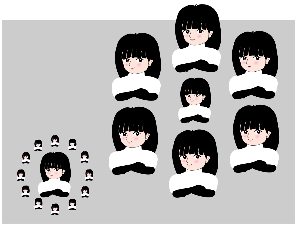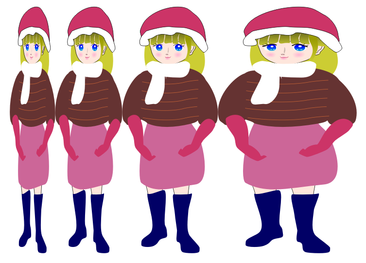 The middle lady in the left group appears to be larger than the one in the right group, though they are the same in size.