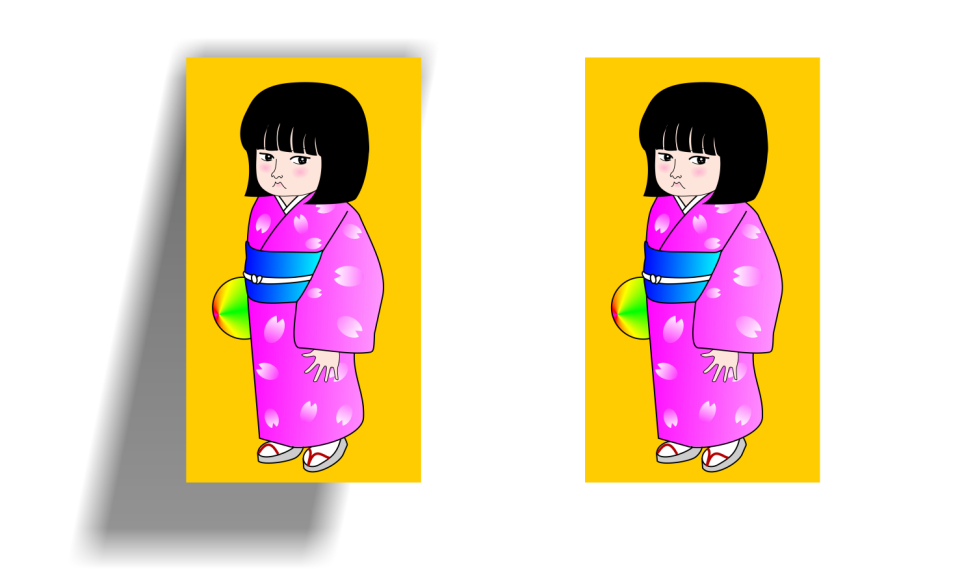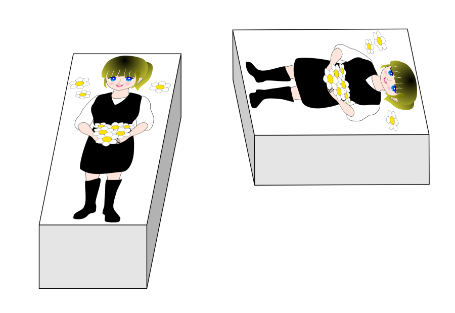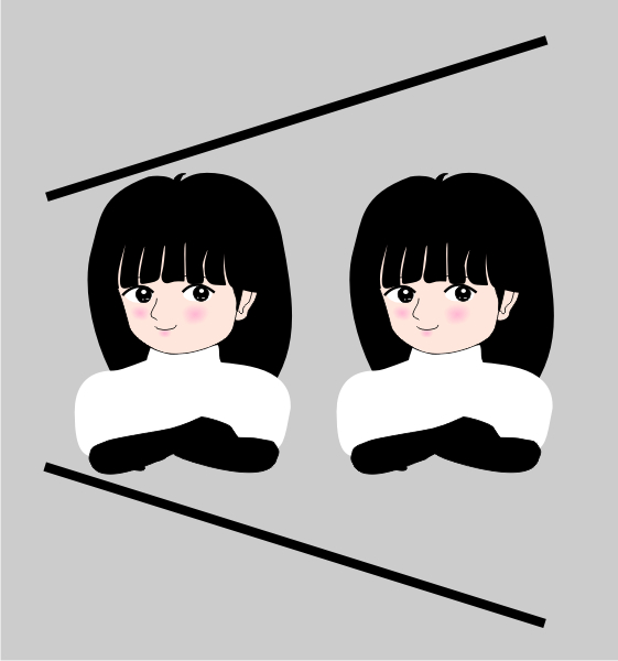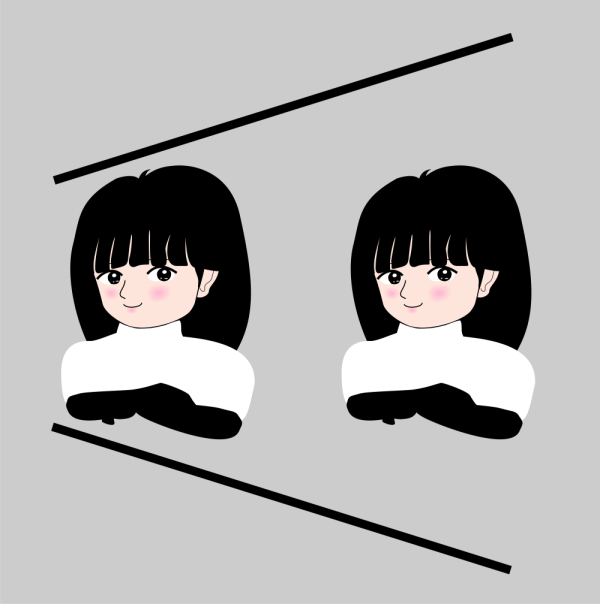 The left girl appears to be slimmer than the right one, though they are identical to each other. This apparent difference depends on the Shepard illusion, one of the most striking geometrical illusions. The Shepard illusion refers to the apparent difference in shape or size between the left and right parallelograms (physically the same shape or size) on that the ladies are drawn.