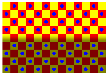 The blue circles in the upper half appear to be different in color from those in the lower half, though they are identical in color.
