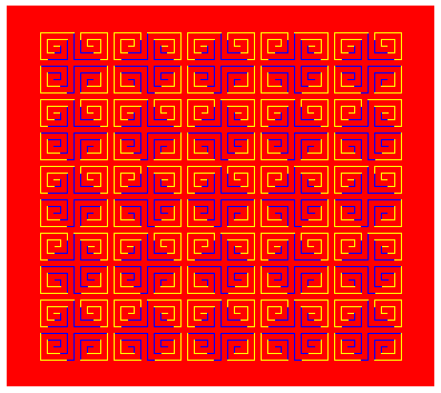 The red is homogeneous over the figure, but appears to be red-purple behind blue lines or to be orange behind yellow lines.