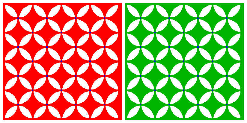 The blue dots are identical between the left and right figures. The dots of the left figure appear to scintillate reddish blue (gunjo in Japanese) while the dots of the right figure appear to twinkle greenish blue (ai in Japanese).