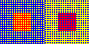 Dotted color illusion: The left red square appears to be orange while the right red one appears to be magenta.