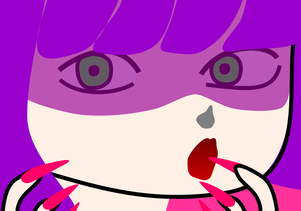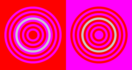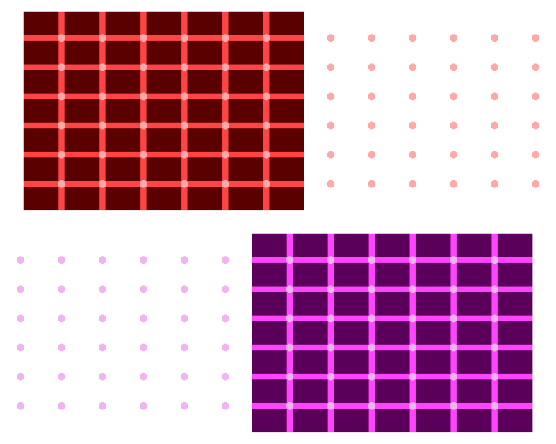 The upper-left image consists of red parts, but the light-red dots appear to be tinted bluish or to scintillate so. The real color of them is shown at the right side. The lower-right image consists of magenta (red-purple) parts, but the light-magenta dots appear to be tinted bluish or to scintillate so. The real color of them is shown at the left side.