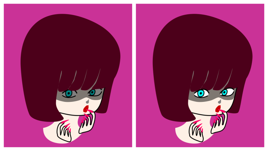 The eyes in the left image appears to be purple while those in the right one appears to be nearly gray, though they are the same color.